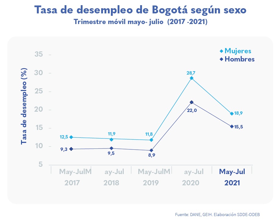 Published in: Boletines La ciudad reporta la tasa de desempleo más baja para mujeres desde que comenzó la pandemia Author Observatorio Economico Published on: 7 de octubre de 2021 Destacados: A julio, en total se crearon más de 300 mil empleos para mujeres y 270 mil empleos para hombres.Para jóvenes, la ciudad generó más de 200 mil nuevos empleos con lo cual se alcanzó una recuperación del 93,2 % frente al periodo de prepandemia. Archivo de descarga: Boletín mercado laboral especial No.84 Temas: Mercado laboral especial. Tipo de Publicación: Boletines