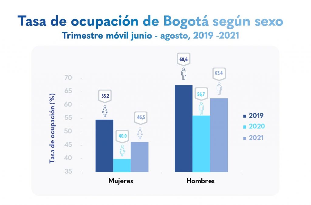 • La tasa de ocupación aumentó en 6,5 puntos porcentuales (p.p.) para las mujeres y 6,7 p.p. para los hombres en el trimestre móvil junio – agosto de 2021, en comparación con el mismo trimestre del año anterior.