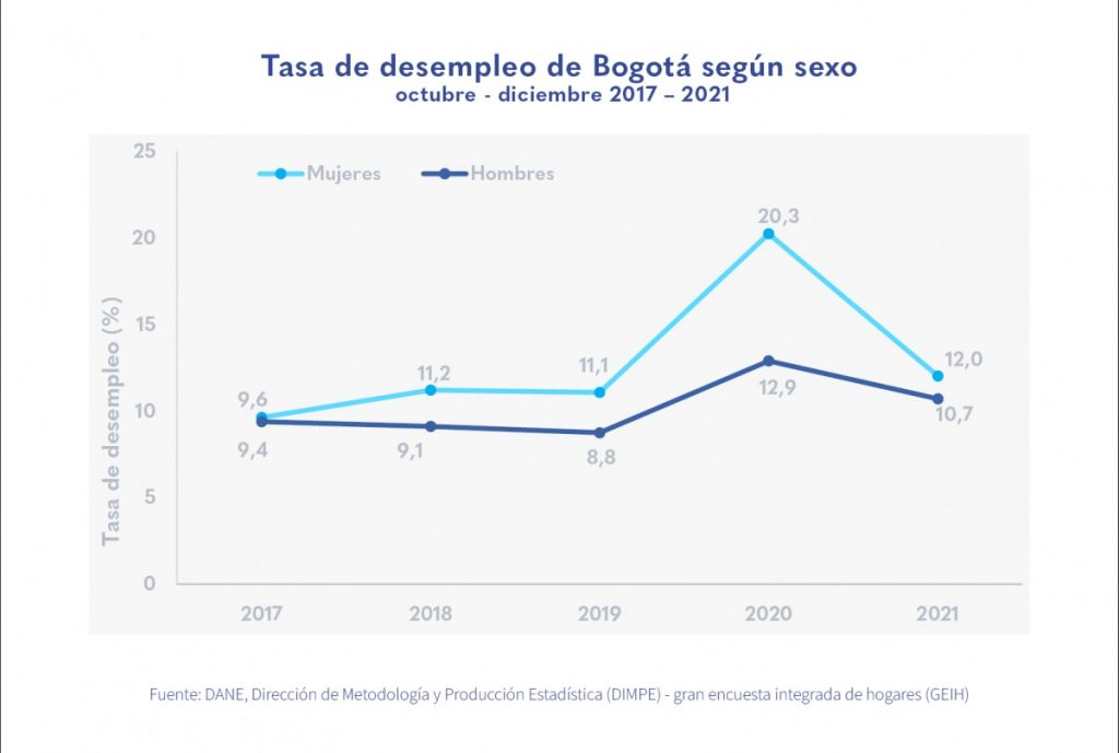 Published in: Boletines En 2021, se cerró la brecha de género en el desempleo pero no en la ocupación Author Observatorio Economico Published on: 25 de febrero de 2022 Destacados: La tasa de desempleo de las mujeres se redujo 2,7 puntos porcentuales (p.p.) en el año corrido 2021, con relación al 2020. La tasa de ocupación juvenil durante el año corrido 2021 aumentó 3,5 p.p., respecto a 2020, y está a 4,9 p.p. de los niveles de prepandemia (2019).La brecha de género en la tasa de desempleo disminuyó 1,0 p.p., entre el año corrido del 2020 y 2021. Archivo de descarga: Boletín mercado laboral especial No.89 Temas: Mercado laboral especial. Tipo de Publicación: Boletines