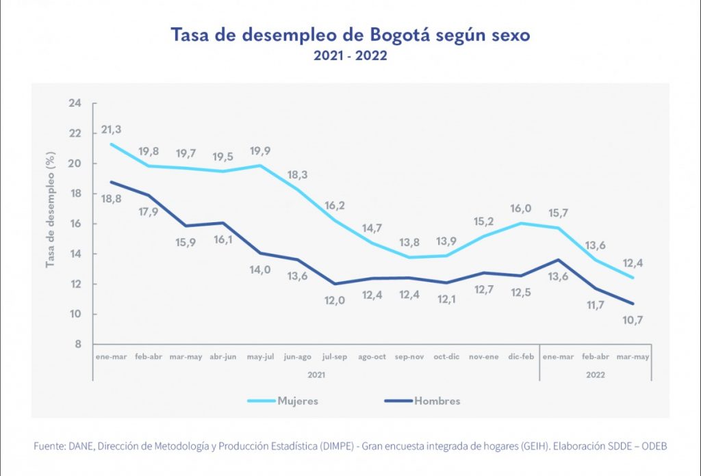La tasa de desempleo de las mujeres se redujo 7,3 puntos porcentuales (p.p.) en el trimestre móvil marzo-mayo de 2022 respecto al mismo periodo del año anterior.