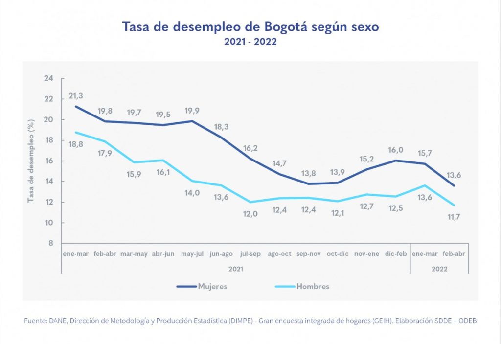 • La brecha de género en la tasa de desempleo cayó 1,6 p.p., entre los trimestres móviles abril-junio de 2021 y 2022.