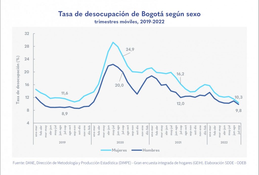 Published in: Boletines La tasa de ocupación de las mujeres aumentó más que la de los hombres Author Observatorio Economico Published on: 17 de noviembre de 2022 Destacados: La tasa de desocupación de las mujeres disminuyó más que la de los hombres en el trimestre julio-septiembre de 2022. La tasa de desocupación juvenil se redujo 4,5 puntos porcentuales (p.p.), registrando 18,9 % en julio-septiembre de 2022. Bogotá se mantiene como la segunda ciudad con menor informalidad fuerte del país. Archivo de descarga: Boletín mercado laboral especial No.96 Temas: Mercado laboral especial. Tipo de Publicación: Boletines