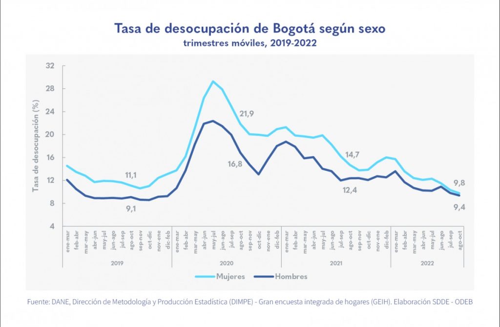 • En el trimestre agosto-octubre de 2022, la tasa de desocupación de las mujeres sigue disminuyendo más que la de los hombres.