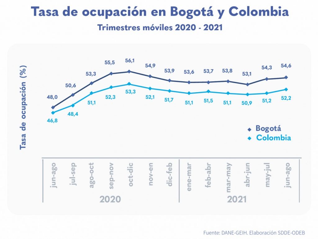 Bogotá registró 509.398 empleos más para el trimestre móvil junio – agosto en contraste con el mismo periodo de 2020.