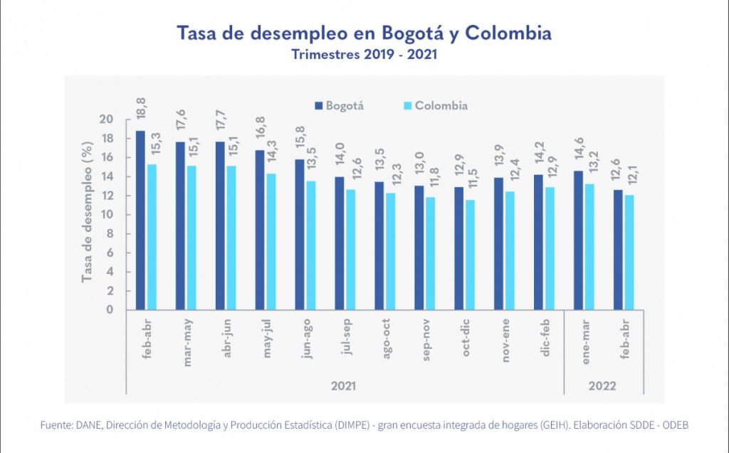• La tasa de desempleo de Bogotá disminuyó 6,2 puntos porcentuales (p.p.) para el trimestre móvil febrero – abril de 2022, respecto al mismo periodo de 2021.