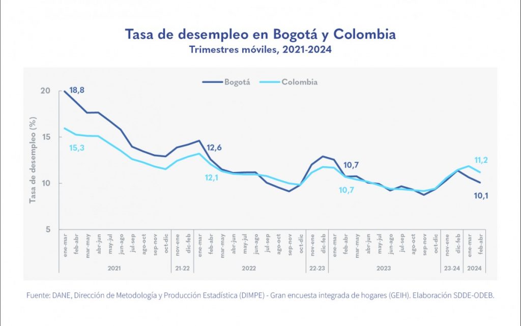 • En el trimestre móvil febrero-abril de 2024, la tasa de desempleo (TD) de Bogotá fue de 10,1 % y estuvo 1,1 puntos porcentuales (p.p.) por debajo del total nacional.