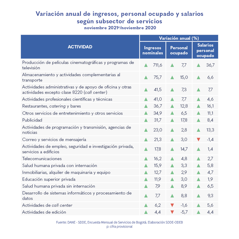 •  Producción de películas cinematográficas y programas de televisión continúa liderando el incremento en los ingresos y los salarios con una variación anual de 711,6 % y 36,7 % respectivamente.