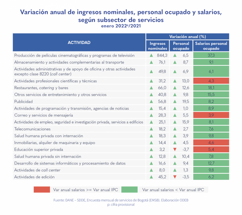 • Catorce actividades del sector de servicios tuvieron un aumento en los salarios, mayor a la variación anual del índice de precios al consumidor (IPC), para el mes de enero en Bogotá.