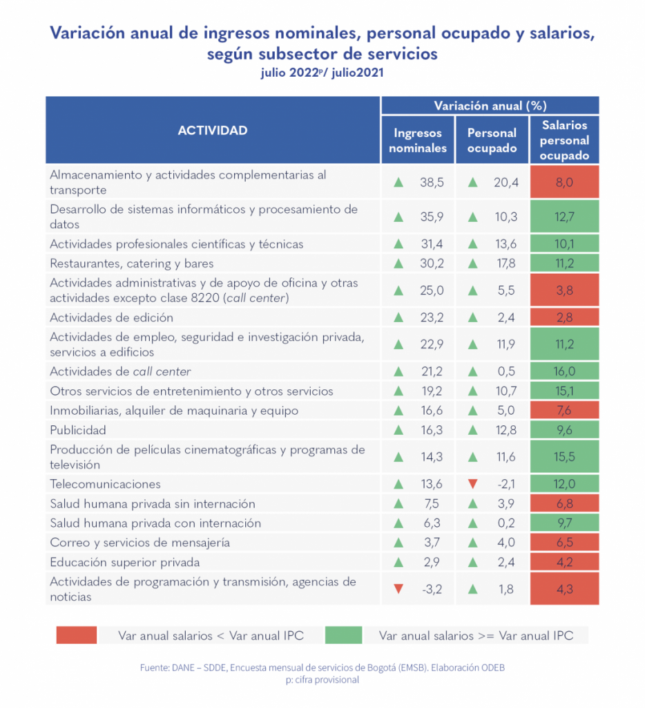 Para el mes de análisis, los salarios aumentaron en las dieciocho actividades, sin embargo ocho de estas actividades lo hicieron por debajo de la inflación anual para Bogotá del mes de julio de 2022.