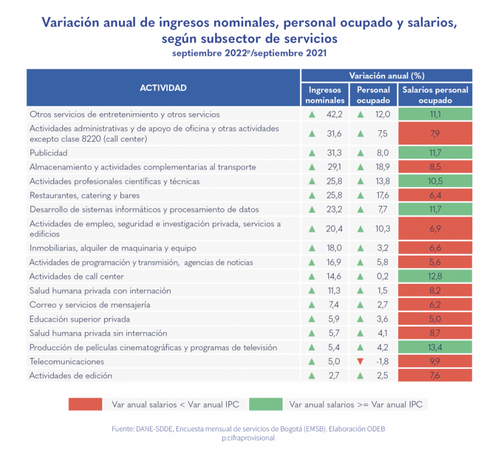 Para el mes de septiembre en Bogotá, seis actividades del sector de servicios tuvieron un aumento en los salarios, mayor a la variación anual del índice de precios al consumidor (IPC).