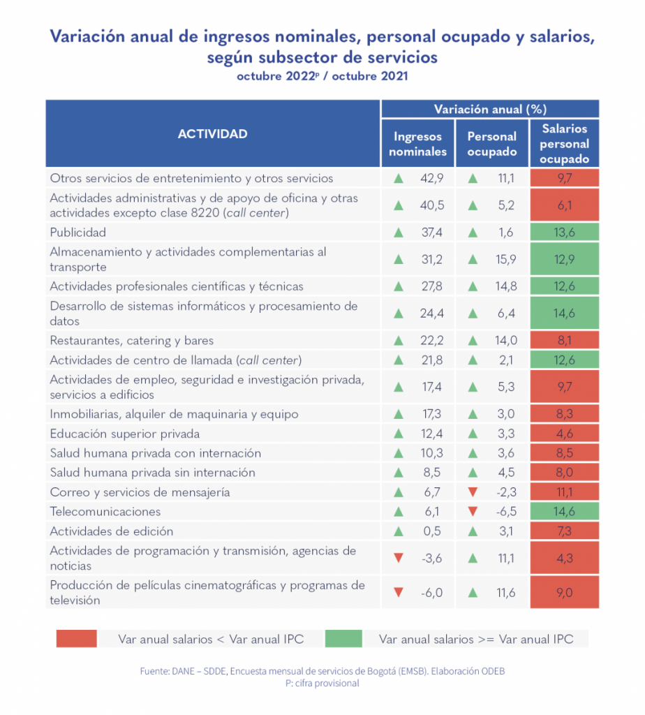 • Para el mes de octubre en Bogotá, seis actividades del sector de servicios tuvieron un aumento en los salarios, mayor a la variación anual del índice de precios al consumidor (IPC).