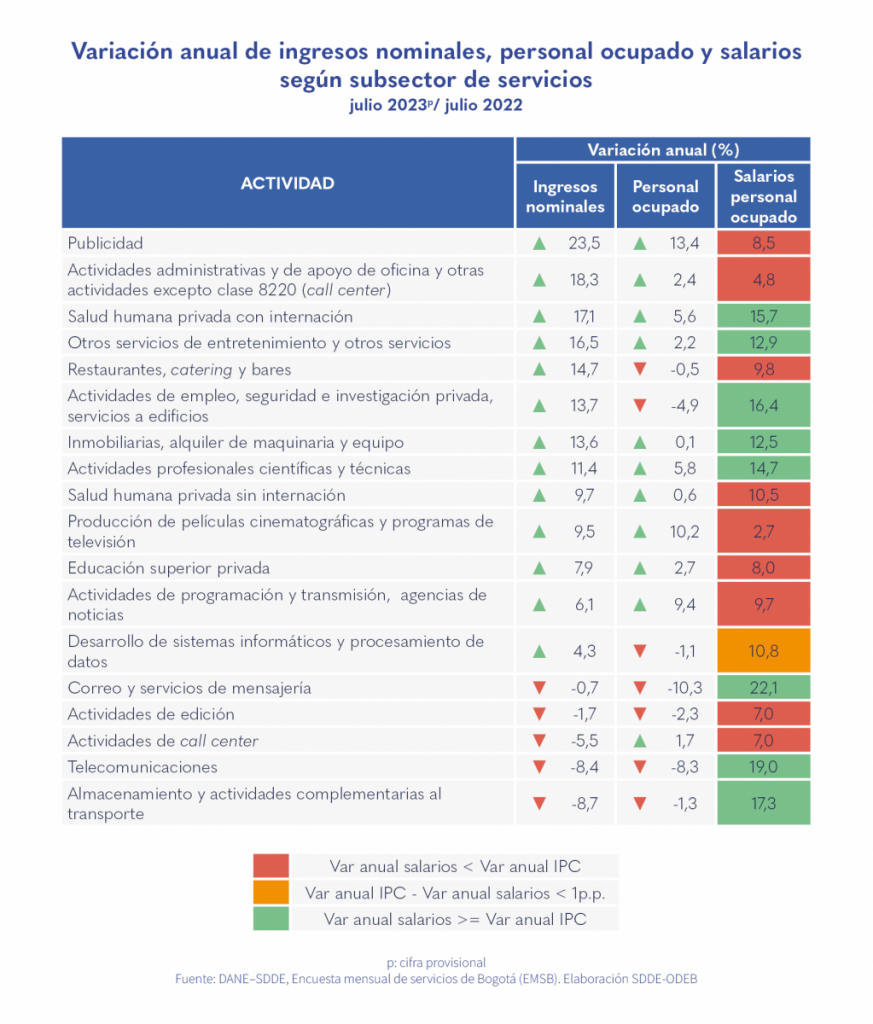 En julio de 2023, publicidad lideró el incremento anual de los ingresos nominales y del personal ocupado con una variación anual de 23,5 % y 13,4 %, respectivamente.