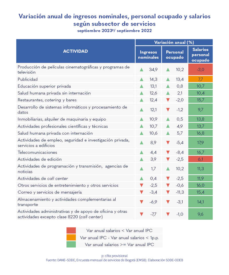 Para el mes de análisis, en quince actividades los salarios aumentaron por encima de la inflación anual de Bogotá.