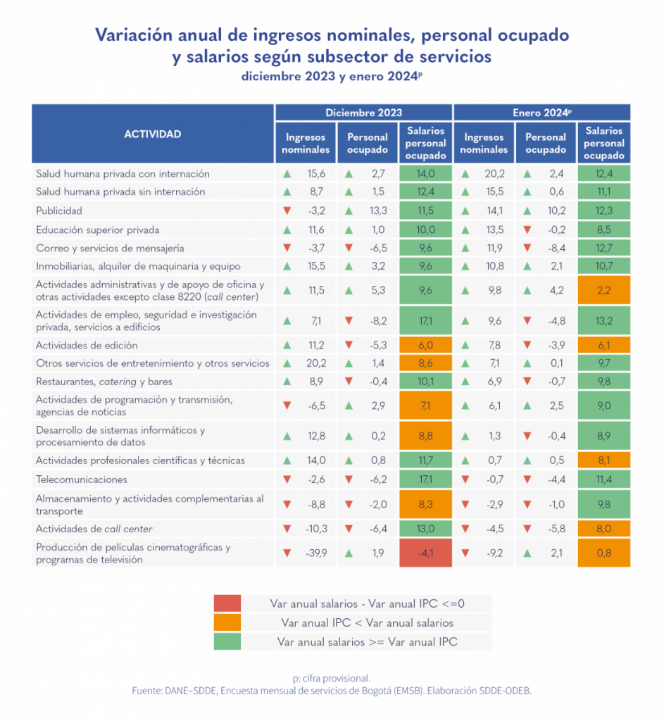 En enero de 2024 todas las actividades aumentaron sus salarios y trece de estas lo hicieron por encima de la inflación anual de Bogotá a enero de 2024 (8,17 %), mientras que, en diciembre de 2023, una actividad disminuyó sus salarios.