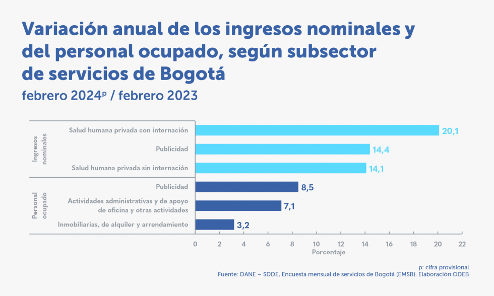Ocho actividades de servicios aumentaron el personal ocupado, dieciséis aumentaron sus salarios y doce de estas lo hicieron por encima de la inflación anual de Bogotá (7,61 %) en febrero de 2024.