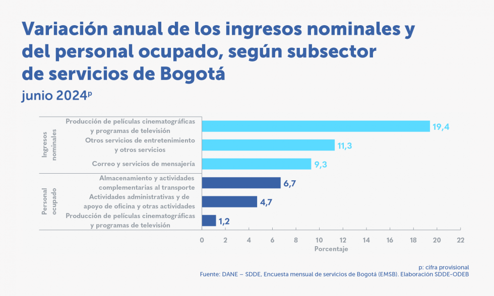En junio de 2024, catorce actividades de servicios aumentaron los ingresos nominales2destacándose: Producción de películas cinematográficas y programas de televisión, otros servicios de entretenimiento y otros servicios, correo y servicios de mensajería y actividades de programación y transmisión.