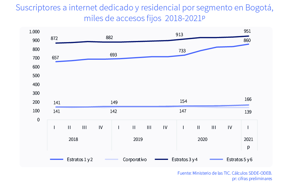 Published in: Boletines Fuerte crecimiento en el número de usuarios de Internet en los estratos 1 y 2 Author Observatorio Economico Published on: 27 de agosto de 2021 Destacados: Entre enero y marzo del presente año se registraron 169.767 nuevos usuarios de Internet en la ciudad, principalmente de los estratos 1 y 2.La fibra óptica aumentó 36,1 % por la necesidad de contar con una conexión más eficiente y rápida en los hogares bogotanos. Archivo de descarga: Boletín TIC No.28 Temas: TIC. Tipo de Publicación: Boletines