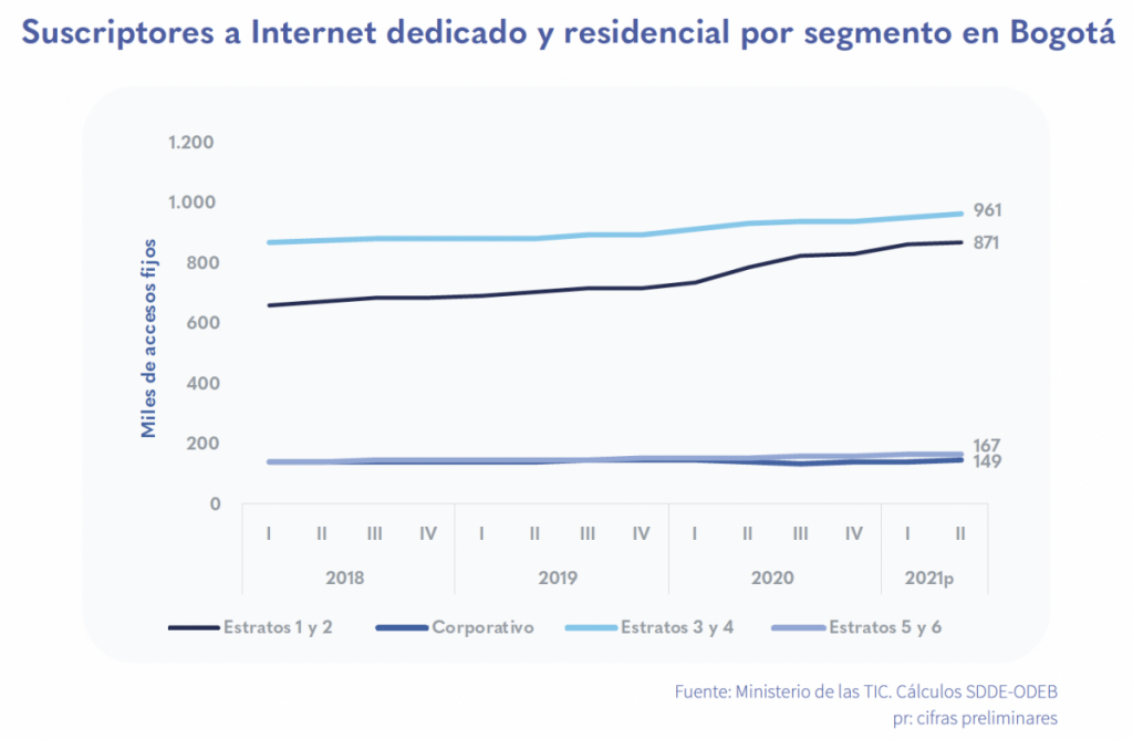 Published in: Boletines Bogotá lidera el acceso a Internet en el país Author Observatorio Economico Published on: 30 de noviembre de 2021 Destacados: El acceso a Internet en Bogotá tuvo un crecimiento del 6,5 % en el segundo trimestre del año.En el segundo trimestre de 2021 se presentó un incremento de 130.641 usuarios, que se concentraron en los estratos 1 y 2. El segmento corporativo aumentó 5,0 % producto de la reapertura y la reactivación económica de la ciudad.La tecnología de fibra óptica sigue siendo las más usada con un ascenso de 33,8 %, debido a la necesidad de contar con una mejor conexión a Internet. Archivo de descarga: Boletín TIC No.29 Temas: TIC. Tipo de Publicación: Boletines
