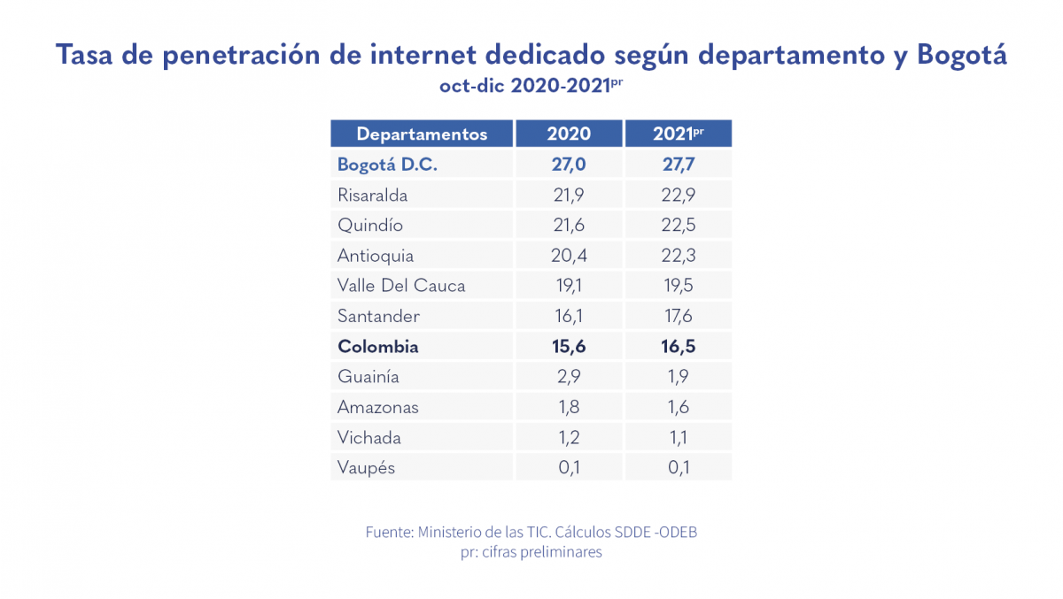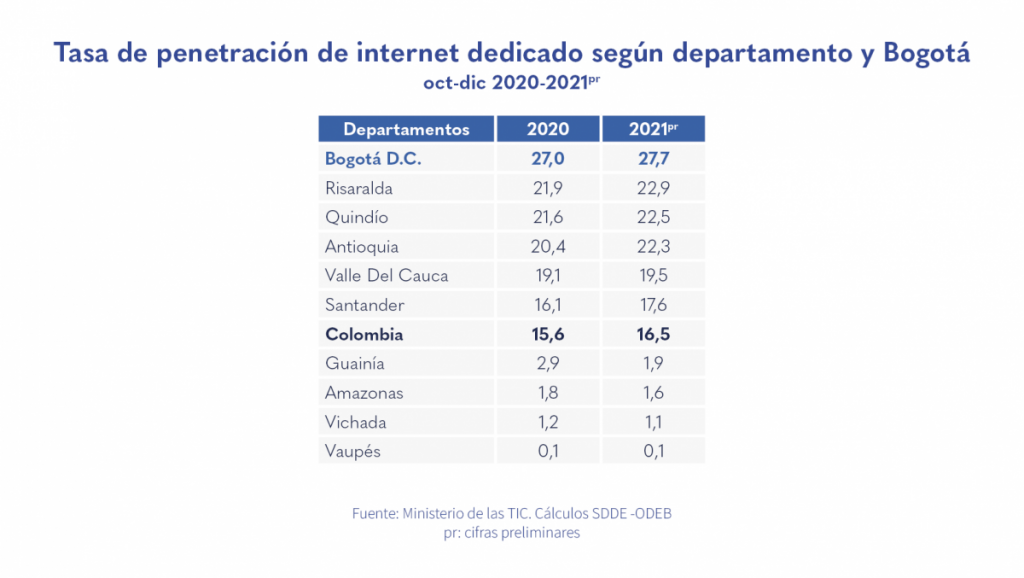 • Para el cuarto trimestre de 2021, la ciudad registró la mayor concentración de usuarios de internet en el país con un 25,7 %.