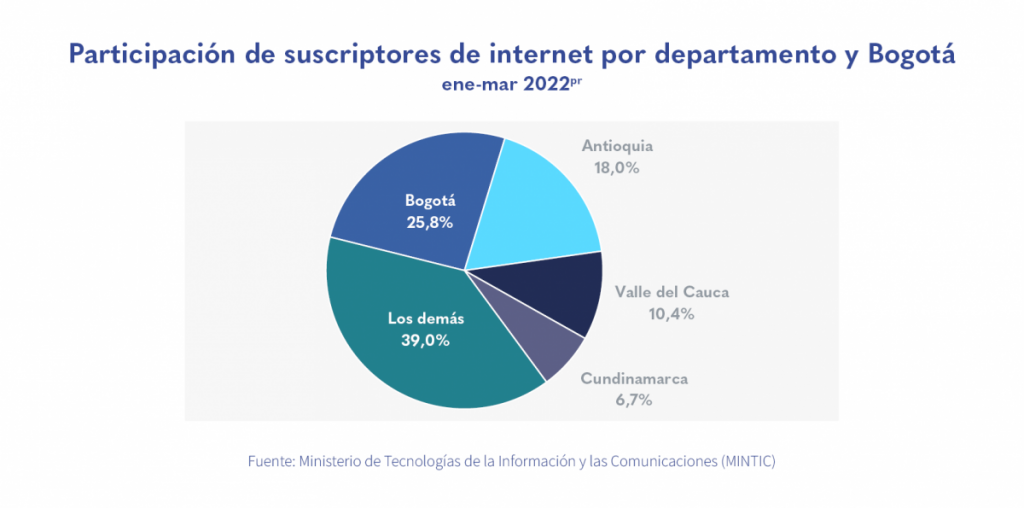 Published in: Boletines En el primer trimestre del 2022, Bogotá alcanzó la mayor concentración de usuarios en el país con un 25,8 % Author Observatorio Economico Published on: 1 de septiembre de 2022 Destacados: Para el primer trimestre de 2022, la ciudad continuó liderando la tasa de penetración del servicio de internet en el país, ubicándose en 27,7 %51.604 nuevos ciudadanos, principalmente de los estratos 3 y 4, cuentan con conexión a internetLa tecnología de fibra óptica de la ciudad, aumentó su cobertura en 35,5 % Archivo de descarga: Boletín TIC No.32 Temas: TIC. Tipo de Publicación: Boletines