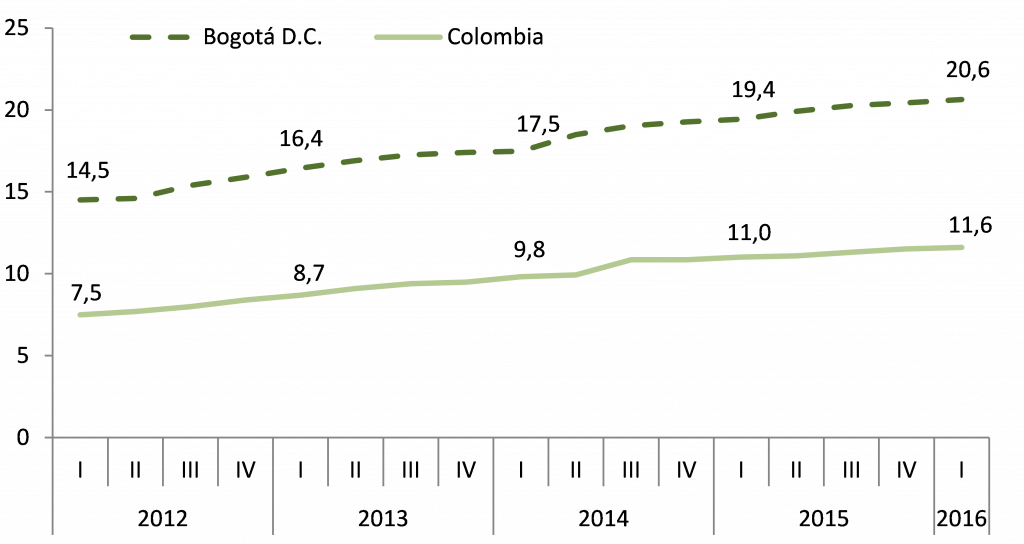 Published in: Boletines El 65% de suscriptores a internet en Bogotá son de estratos 2 y 3 Author Observatorio Economico Published on: 19 de octubre de 2016 Destacados: En el primer trimestre de 2016, Colombia registró un índice de penetración de internet dedicado del 11,6%, superior en 0,6% al observado en 2015.Bogotá es la tercera ciudad con mayor penetración de internet dedicado en el país (20,6%), después de Bucaramanga (25,4%) y Medellín (21%).Telmex lidera la lista de empresas con más suscriptores a internet en Bogotá con 782.000 personas. Archivo de descarga: Boletín TIC No.8 Temas: TIC. Tipo de Publicación: Boletines